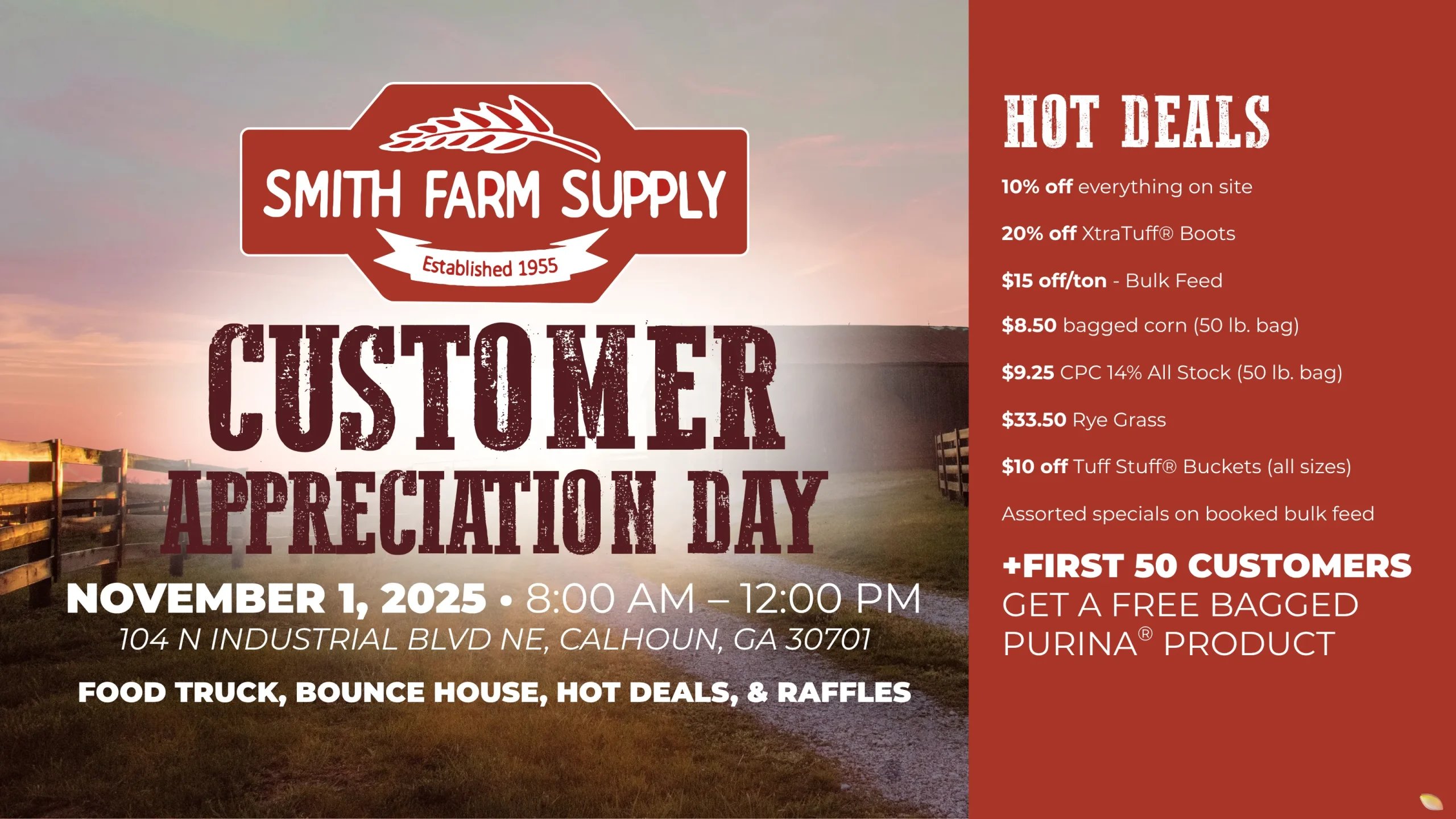 Food truck, bounce house, hot deals, & raffles. First 50 customers get a FREE bagged Purina product!