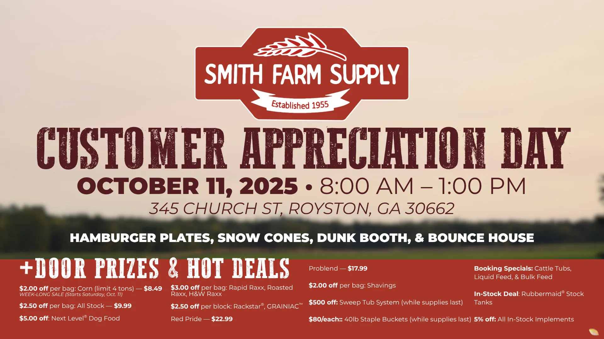 Enjoy hamburger plates, snow cones, a dunk booth, & bounce house. Plus, door prizes and hot deals!